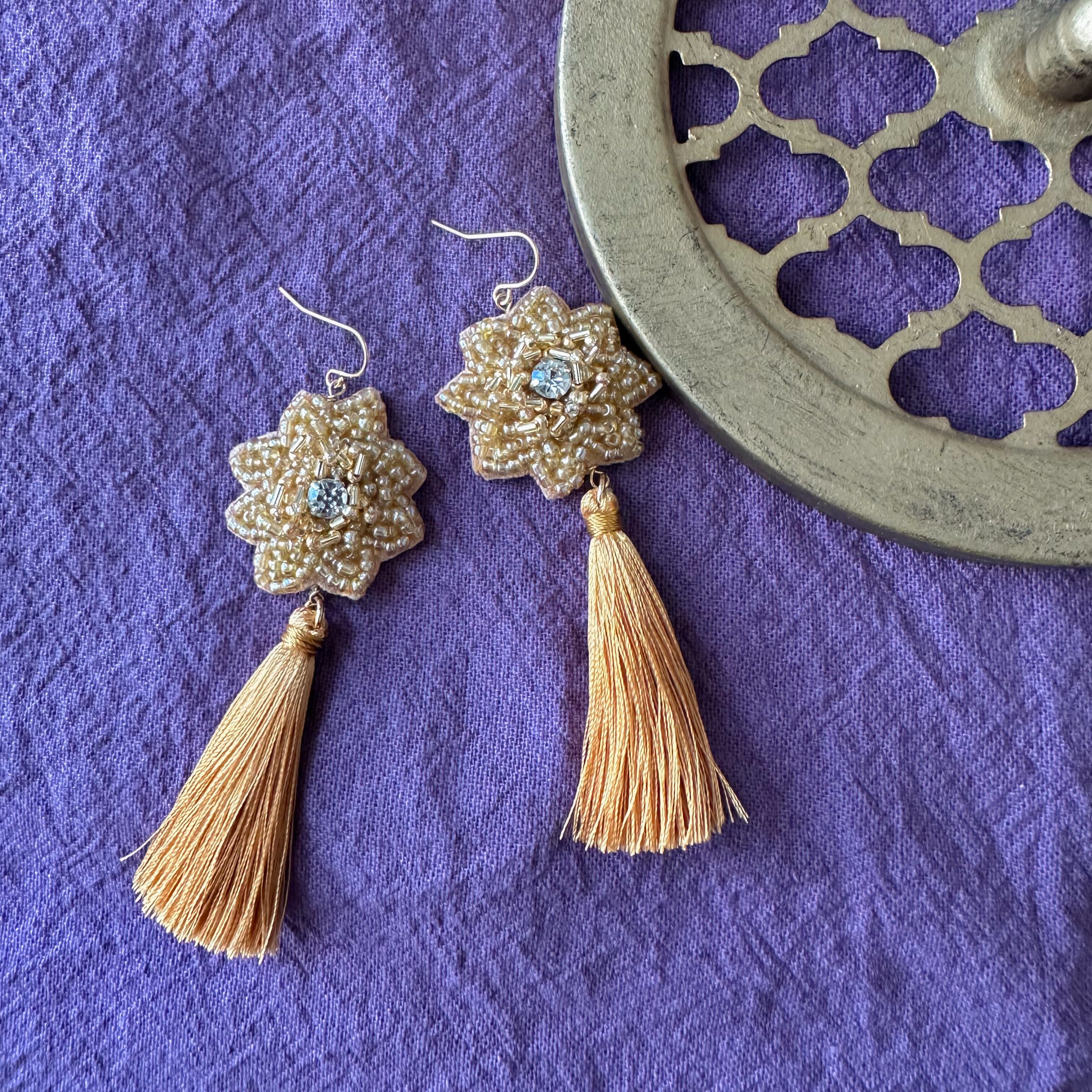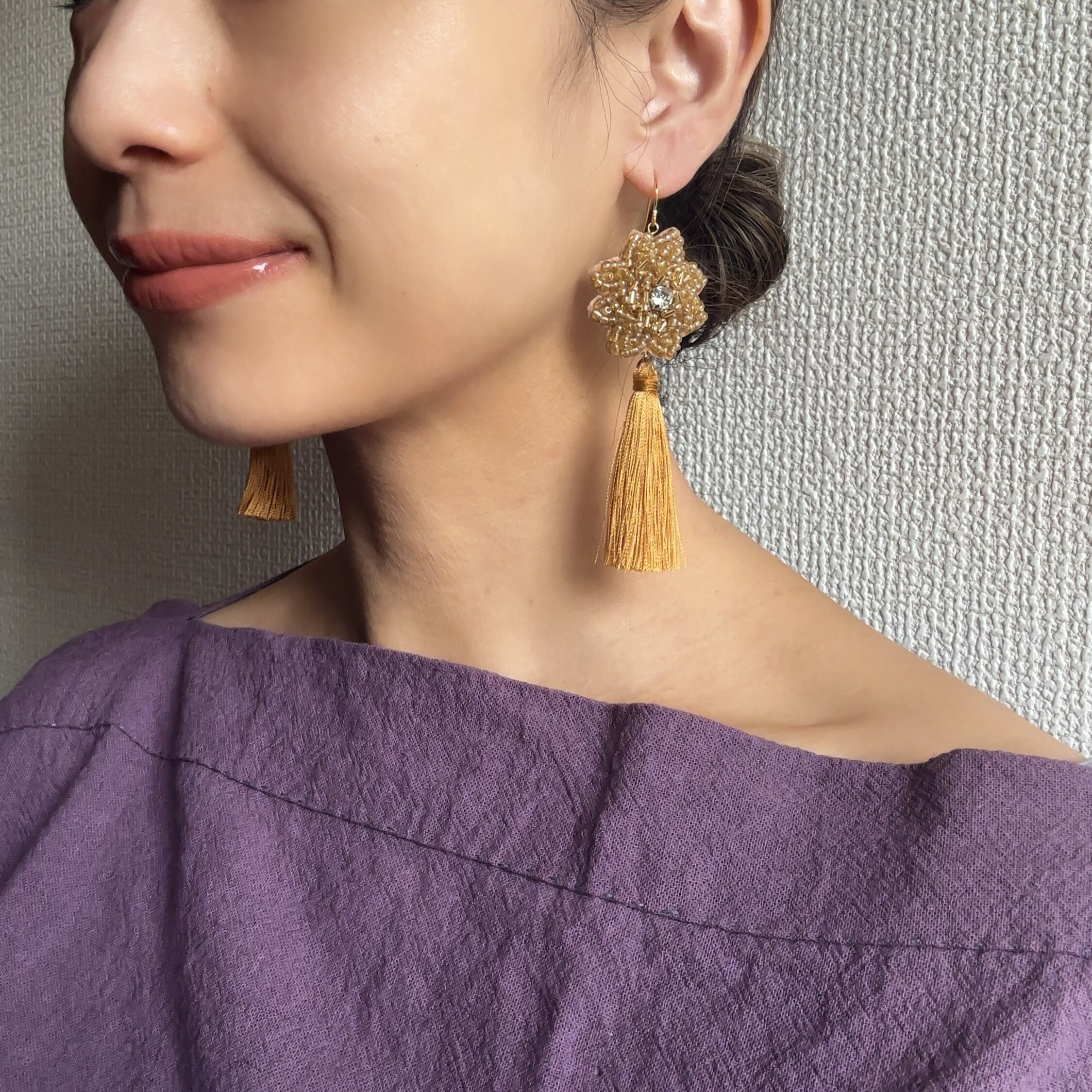 ビーズでお花を刺繍し同型のタッセルを合わせて